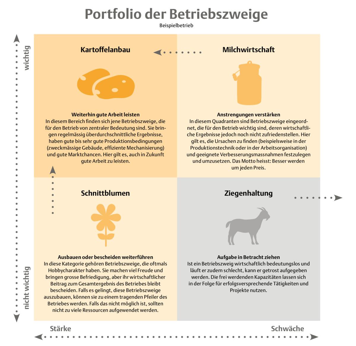 Mit dem Betriebszweig-Portfolio lassen sich jene Betriebszweige ermitteln, welche für den Fortbestand des Landwirtschaftsbetriebes wichtig sind. Es lohnt sich, die Analyse regelmässig vorzunehmen und allfällige Verbesserungsmassnahmen zu definieren. So wird sich der Betrieb wirtschaftlich erfolgreich entwickeln. Die Einordnung erfolgt anhand der beiden Kenngrössen Wichtigkeit und Stärke eines Betriebszweigs.