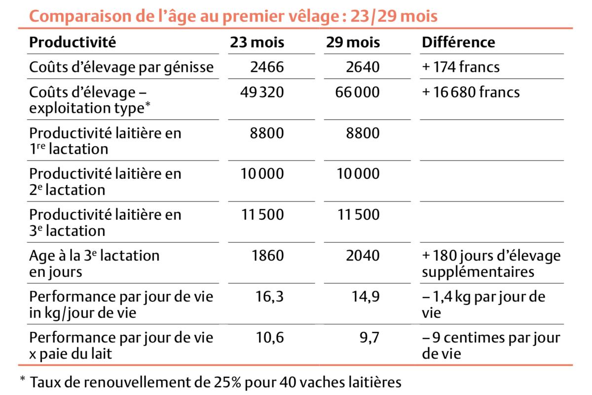 La portée des répercussions économiques de l’âge au premier vêlage est illustrée dans l’exemple ci-contre (cf. tableau). Avec un âge au premier vêlage de 23 mois, le forfait mensuel dans l’élevage sous contrat est d’environ 137 francs. Pour un élevage externe de 18 mois, les coûts d’élevage sont de 2466 francs par génisse. La situation est différente lorsqu’une génisse vêle à 29 mois et passe 24 mois en élevage sous contrat. En effet, selon Agridea, le forfait mensuel s’élève seulement à 110 francs en raison de l’alimentation moins intensive. Vu la durée d’élevage plus longue, les coûts s’élèvent cependant à 2640 francs. L’effet est bien plus prononcé dans le renouvellement du cheptel. Sur une exploitation de 40 vaches avec un taux de renouvellement de 25 %, environ 10 animaux par an doivent vêler pour un âge au premier vêlage de 23 mois et environ 12,5 animaux pour un âge au premier vêlage de 29 mois (calcul théorique). Dans notre exemple de calcul, les animaux supplémentaires entraînent alors des surcoûts d’élevage notables (cf. tableau).