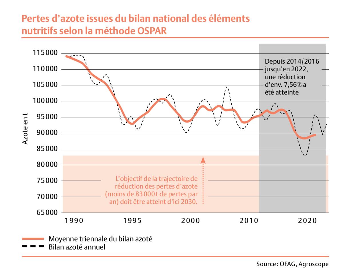 Les objectifs de la trajectoire de réduction des pertes d’éléments nutritifs ne sont pas encore atteints et nécessitent un effort supplémentaire de toute la branche. La baisse des pertes en azote et en phosphore passe par une amélioration de la génétique, des techniques d’alimentation plus précises et des aliments pauvres en éléments nutritifs bruts mais riches en additifs. Cependant, un effort est aussi nécessaire au niveau des institutions responsables de ces bilans. En effet, tant que les teneurs de matières premières de référence ne seront pas à jour, il y aura une surestimation des quantités d’azote importées ainsi que des pertes issues de l’agriculture.