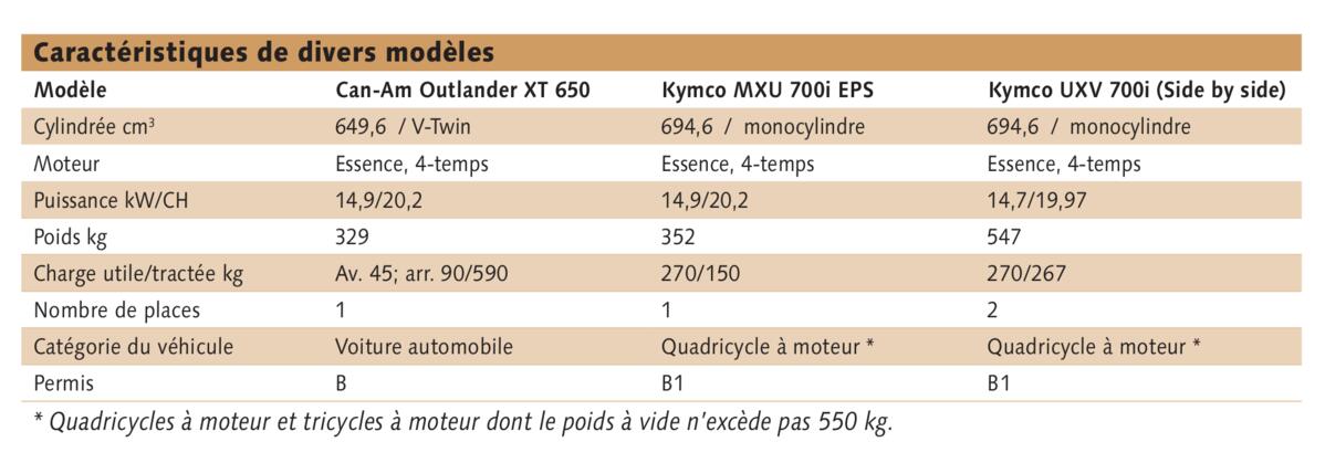 Dans le commerce, on trouve de nombreux modèles de quads. Il existe des engins sportifs ou de loisirs: il s’agit de modèles légers, dépassant à peine une centaine de kilos, équipés d’un moteur de moto et dépourvus de porte-bagage. Dans la catégorie des utilitaires, on trouve des quads équipés de porte-bagages, d’un moteur à transmission vario et pesant jusqu’à 350 kg environ. Les engins appelés side by side vehicle(SSV) constituent la troisième catégorie. Pour ce type d’appareil, les constructeurs usent de tous les moyens pour ne pas dépasser la limite de 550 kg à vide.