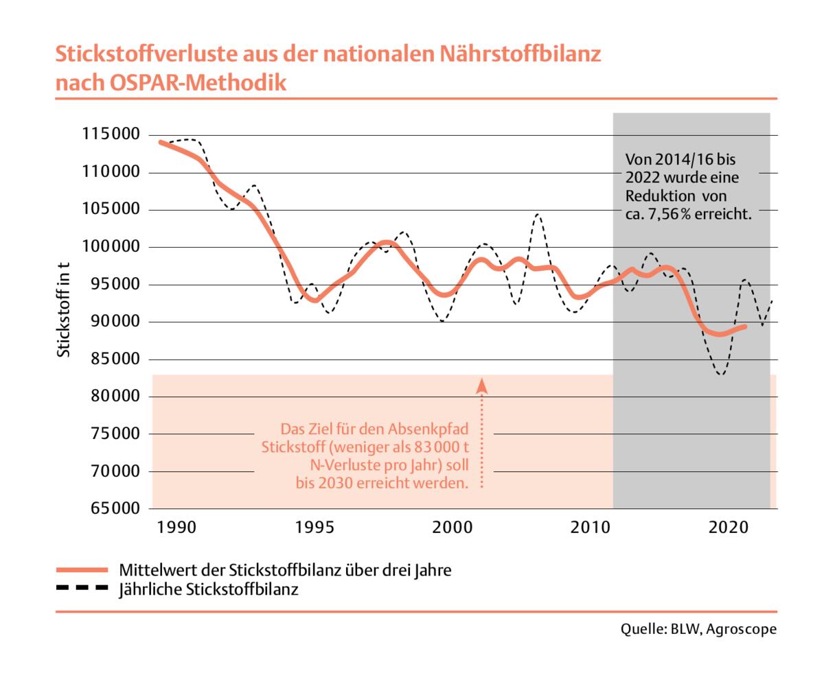 Die Ziele des Absenkpfads Nährstoffe sind bislang noch nicht erreicht. Eine Reduktion der Stickstoff- und Phosphorverluste gelingt durch Fortschritte in der Genetik, den Einsatz präziserer Fütterungstechniken sowie durch den gezielten Einsatz von Zusätzen wie Aminosäuren. Wünschenswert wäre weiter eine Aktualisierung der Referenzwerte für die Rohstoffgehalte. Denn solange diese nicht angepasst sind, werden sowohl die Menge des importierten Stickstoffs als auch die Verluste in der Landwirtschaft überschätzt.