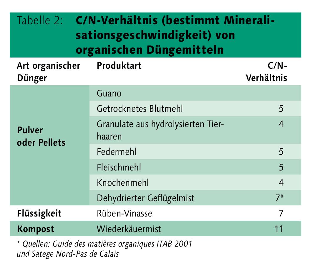 Wie bei Hofdüngern und Kompost werden die Nährstoffe aus organischen Handelsdüngern erst durch die Mineralisation verfügbar. Für die Effizienz von Bio-Düngern sind daher ein gesundes Bodenleben, eine gute Bodenstruktur, eine ausreichende Bodenfeuchtigkeit und milde Temperaturen notwendig. Die Nährstoffverfügbarkeit der Dünger wird vom Verhältnis Kohlenstoff zu Stickstoff bestimmt (C/N-Verhältnis). Je enger das C/N-Verhältnis (= tiefe Zahl = viel Stickstoff und wenig Kohlenstoff), desto schneller ist der Stickstoff verfügbar ( siehe Tabelle 2). Durch das enge C/N-Verhältnis der Handelsdünger ist die Hauptwirkung bereits für die geplante Kultur zu erwarten. Die Wirkung kann dadurch genauer gesteuert werden als bei anderen Düngern wie Kuhmist oder Kompost. Die organischen Handelsdünger werden als Pellets angeboten. Die Verfügbarkeit des Düngemittels wird durch Feuchtigkeit und durch das Einarbeiten mit dem Striegel oder einer Rollhacke beschleunigt. Da die organischen Handelsdünger in Pelletform je nach Bedingungen 25 mm Niederschlag benötigen, um sich aufzulösen, ist ein frühes Ausbringen ratsam.