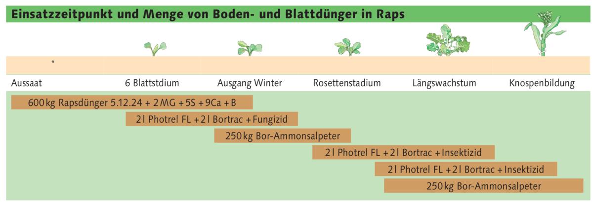 Mikronährstoffe sind im Herbst zum Einlagern und in der Streckungsphase wichtig. Besonders Bor ist für die Entwicklungsphase Blüte bis Samenbildung unentbehrlich. Mit einer Borgabe über das Blatt wird die Winterfestigkeit verbessert. Bor kann in der Pflanze nicht eingelagert werden, daher ist eine mehrmalige Behandlung so nahe wie möglich an der Blüte empfehlenswert. Im Herbst kann die erste Bor-Gabe über das Blatt (z.B. mit Bortrac oder Photrel) zusammen mit einem Fungizid oder Wachstumsregler appliziert werden. Im Frühjahr folgen zwei weitere Gaben.