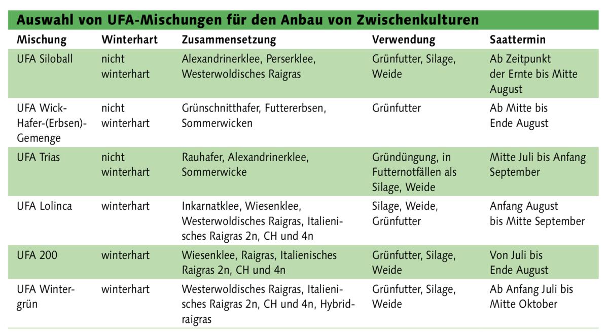 Sind diese Punkte alle abgeklärt, steht die Wahl der richtigen Saatgutmischung an. Die Mischungen werden in zwei Kategorien unterteilt: einjährige, abfrierende Zwischenkulturen sowie winterharte Kulturen, die sogar zwei- oder mehrjährig sein können. Daneben unterscheidet man zwischen Saatmischungen auf Basis von Raigras, Raigras mit Klee und Mischungen auf Basis von Grünschnitthafer (Wick-Hafer-(Erbsen-) Gemenge). Bei schwierigem Herbstfutterbauwetter bringen Gemenge den sichersten Ertrag. Vor allem bei Frühsaaten, wo noch hohe Temperaturen, Trockenheit oder Fritfliegen zu erwarten sind, bringen sie Vorteile gegenüber normalen nicht überwinternden Klee-Grasmischungen.